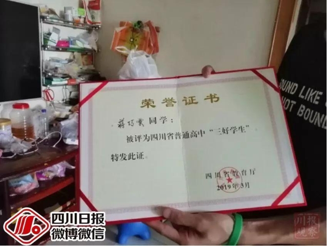 而三个孩子也十分刻苦,在今年3月,蒋巧云被四川省教育厅评为四川省普通高中“三好学生”。