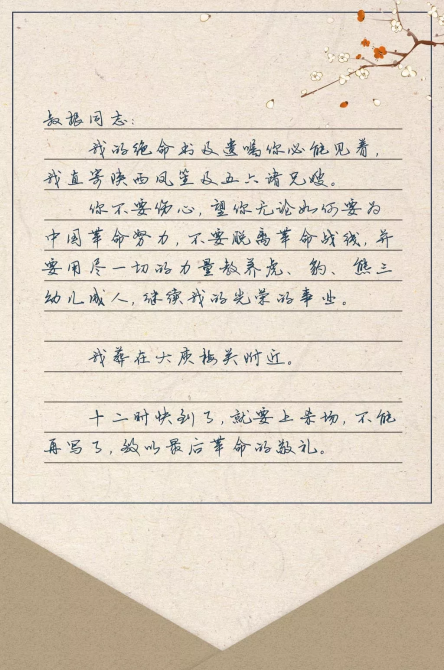 刘伯坚写给妻子信中的最后一句话是:“十二时快到了,就要上杀场,不能再写了,致以最后的革命的敬礼!”一边是森严的杀场,一边是从容的留墨,这是一种怎样的凛然和镇定。正如老将军宋任穷所说的:“刘伯坚这个人真了不起,快要上杀场了,还是那样镇定自若的写家书,信上的字迹和笔画,跟平时工作时的字迹和笔画一模一样,一点没有变。”