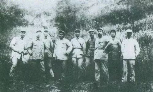 1933年11月,叶剑英(左起)、杨尚昆、彭德怀、刘伯坚、张纯清、李克农、 周恩来、滕代远、袁国平等红一方面军领导在福建建宁。