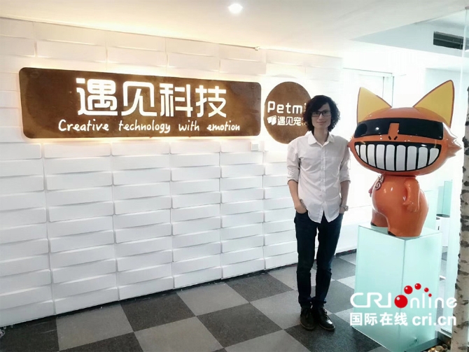 遇见科技,2015年夏天入驻前海自贸区。走进公司,首先看到的是他们公司的前台,一头叫天天的布偶猫和一米高的戴着眼镜、笑容灿烂的大猫卡通模型,这头大猫是公司创始人廖玉柯画的自己。