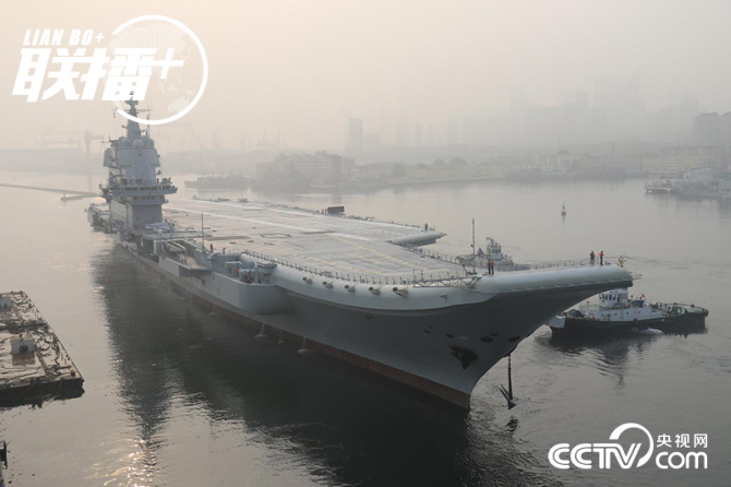 我国第二艘航母从大连造船厂码头启航,赴相关海域执行海上试验任务,主要检测验证动力系统等设备的可靠性和稳定性(2018年5月13日摄)。