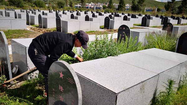 这个季节,每天早晨六点半,罗建国起床后,就会来到离家两百多米远的红原县邛溪镇革命烈士陵园,开始清理陵园里疯长的野草,擦拭那一座座大理石墓碑和坟茔。