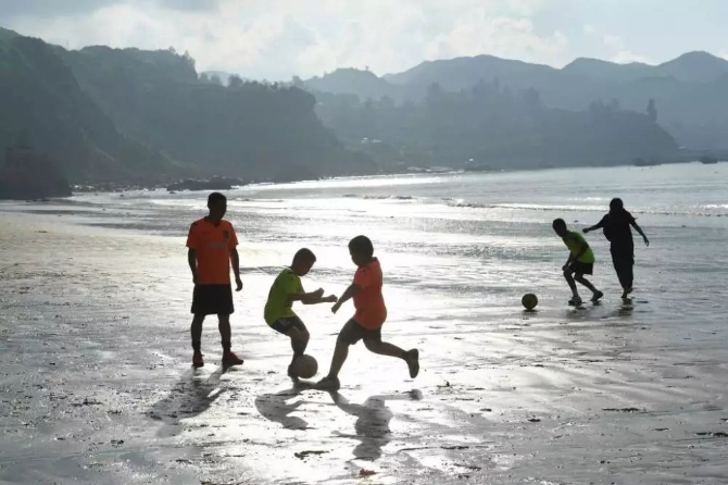 “长风”足球队里的孩子都喜欢在海边踢球。