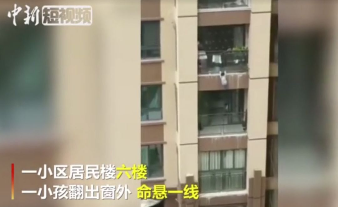 刘先生告诉记者:“很大声,有尖叫,有呼喊。”他回忆,自己到了窗台,只见对面7栋楼下站了很多人,大家的目光都望向同一个方向。他顺着众人望向的地方搜寻,看到7栋6楼一户人家的窗台外面,一个穿着睡衣的小孩,两只手吊在两扇玻璃间的铁栅栏上。