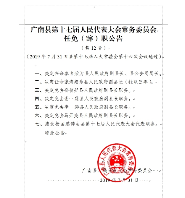 昆明信息港讯 机器人小明 8月1日,广南县发布第十七届人民代表大会常务委员会任免(辞)职公告,任命秦自荣为县人民政府副县长、县公安局局长,具体公告如下: