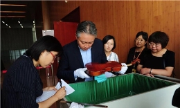 6月18日,高彤彤、高参一行莅临云南省博物馆,对聂耳小提琴进行了仔细的“体检”。云南省博物馆副馆长田景能、技术部主任沐蕊、保管部主任樊海涛及相关工作人员向高彤彤一行介绍了聂耳小提琴概况。