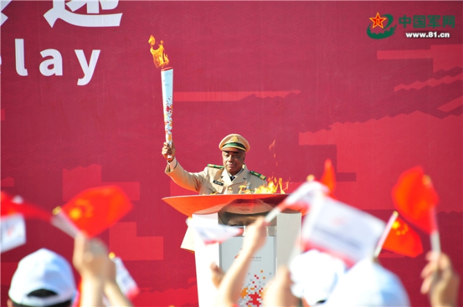 国际军事体育理事会秘书长曼比·科伊塔在火炬传递仪式现场点燃第一支火炬。郑文达 摄