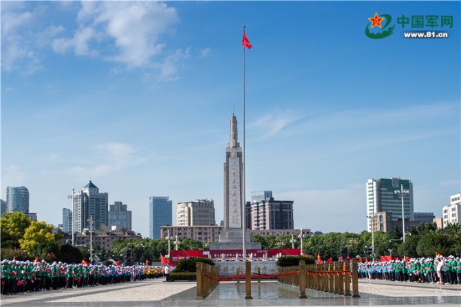 在这军旗升起的地方,熊熊燃烧的圣火背后,八一南昌起义纪念塔,形如军刺,落地成碑。