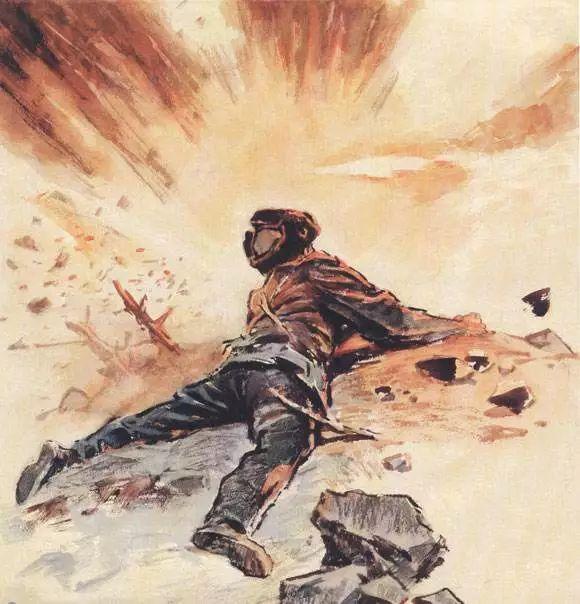 黄继光冒着枪林弹雨,带着两名战友,在我军火力掩护下,向0号高地冲去。