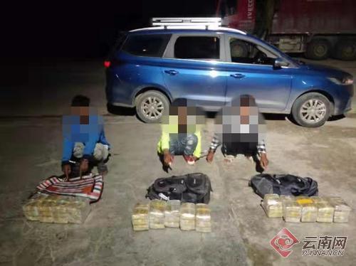 7月29日,河底岗边境检查站根据线索,及时出动警力前往核查封控,在辖区成功抓获一个贩毒团伙,从3名男子携带的双肩背包内查获外用黄色胶带包裹的毒品冰毒23.26公斤。