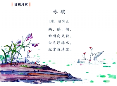 与以往不同的是,小学统编《语文》教材大大加强了古诗词的积累量。据了解,教材中除语文课程标准中推荐的75首古诗词外,还选入了适合小学生阅读、背诵的古诗词540余首。这些古诗词多数没有以课文的形式出现,而是增加在课后的“日积月累”这个栏目中。该栏目的教学要求是让学生背诵、积累,但对诗句意思的理解、对诗人表达的感情不要求掌握,等学生达到一定的年龄,便会自通其义,在生活、工作中自如运用。
