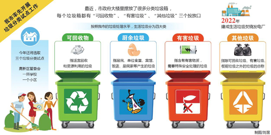 按照不同成分、属性、利用价值、对环境的影响以及不同处理方式的要求,我市的生活垃圾主要分为可回收物、餐厨垃圾、有害垃圾和其他垃圾四大类。未来,我市产生的可回收物交由废旧物资回收企业或再生资源利用企业,生产再生产品;餐厨垃圾送至餐厨垃圾处理厂,生产有机肥料和生物油脂;有害垃圾给有害垃圾企业专业处理;其他垃圾则可以通过垃圾焚烧发电厂,真正实现垃圾的减量化、资源化和无害化处理。