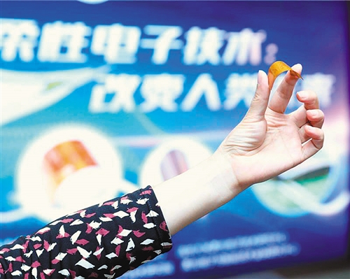 在第二届柔性电子国际学术大会上,研发人员现场展示可任意卷曲弯折的超薄柔性芯片。周烨摄