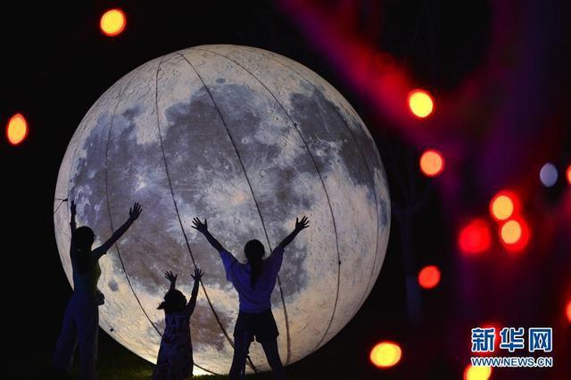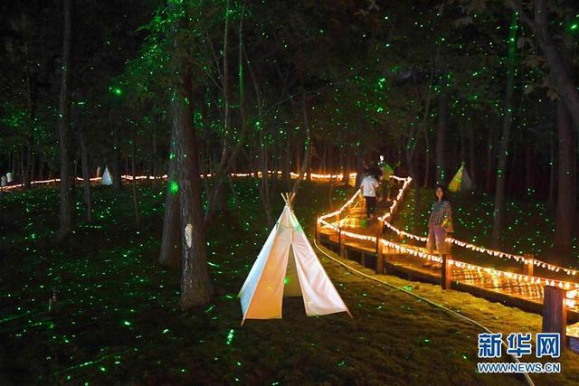 游客在河北省沙河市红石沟现代农业园区夜间举办的“梦幻灯光节”上游玩(6月28日摄)。新华社记者牟宇摄