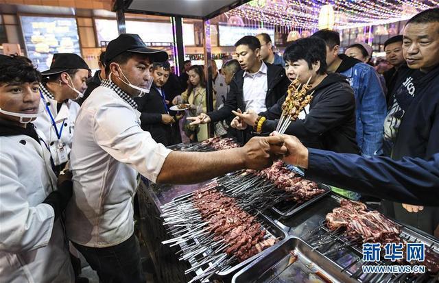 在乌鲁木齐五一星光夜市,人们排队购买烤羊肉串等美食(5月6日摄)。新华社记者王菲摄