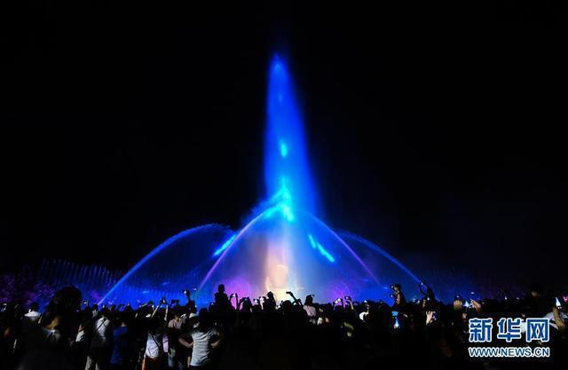 人们在吉林长春净月潭国家森林公园内欣赏音乐喷泉水景灯光秀(8月4日摄)。新华社记者张楠摄