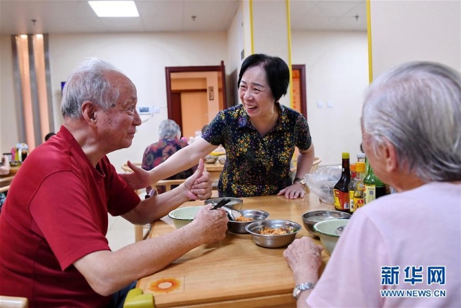 福州市鼓楼区东街街道军门社区党委书记林丹(中)在社区居家养老服务照料中心与就餐老人刘建国(左)和他的老伴打招呼(7月30日摄)。新华社记者 林善传 摄