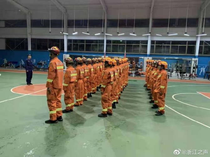 绍兴市消防救援支队紧急出动抢险救援车、器材运输车、远程供水系统等8辆消防车、45名指战员携带1艘冲锋舟、7艘橡皮艇等水域救援装备驰援。