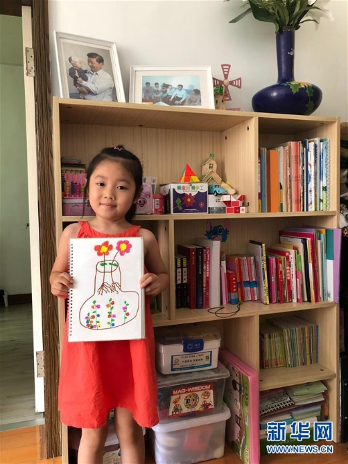 在沈阳市沈河区大南街道多福社区,丛龙江的孙女丛婧涵在展示自己的画作(7月20日摄)。 新华社记者 于也童 摄