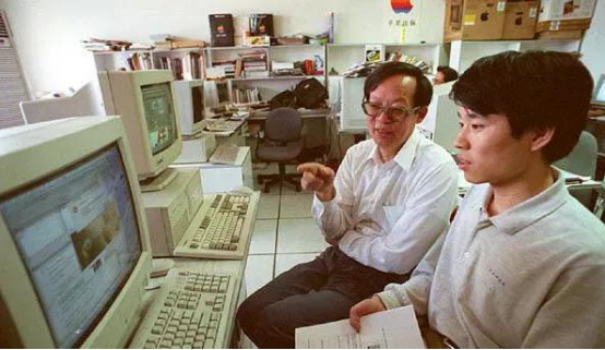 1994年1月,北大方正集团研制成功高档彩色出版系统,王选(左)在介绍这一科研成果。图片来源:新华网