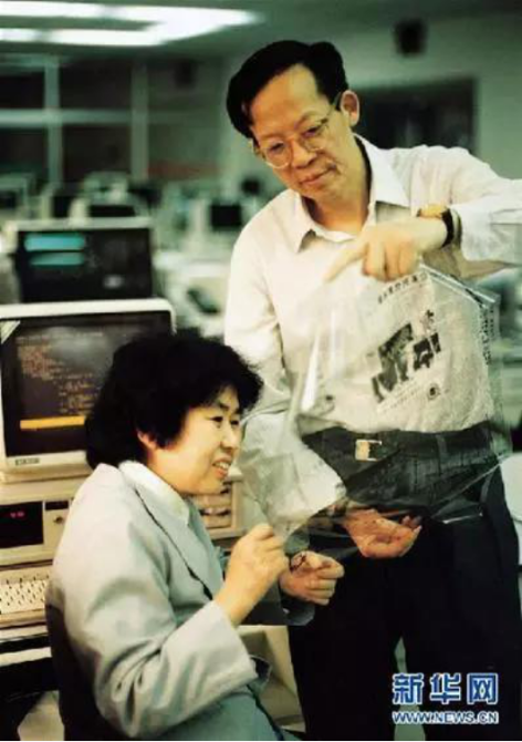 1994年,王选与妻子陈堃銶一起查看汉字激光照排系统输出的排版胶片。图片来源:新华网
