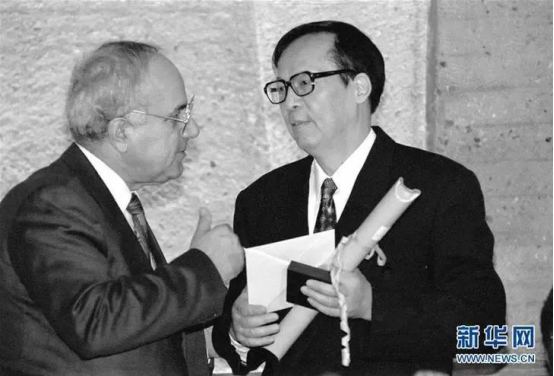 1995年11月6日,联合国教科文组织副总干事巴德兰向“联合国教科文组织科学奖”获得者王选(右)颁奖。图片来源:新华网