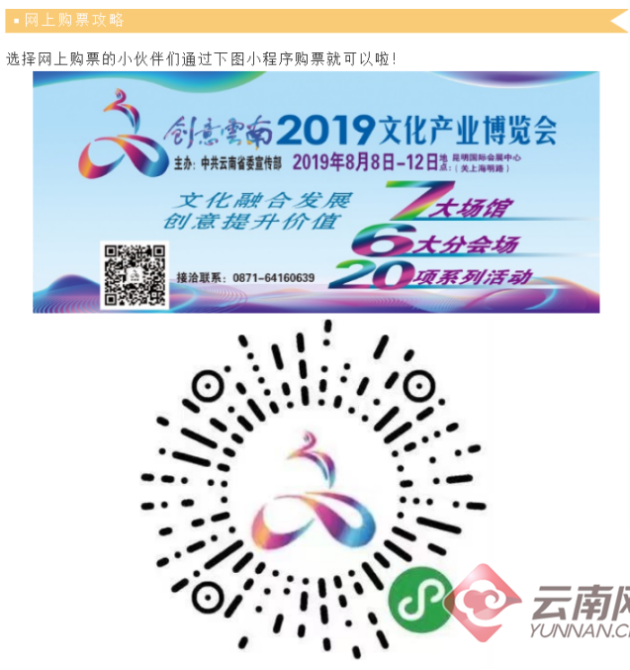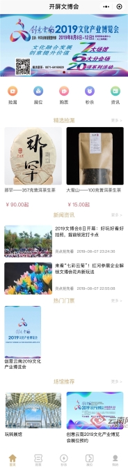 在展会门票的发售上,创意云南2019文化产业博览会首次采用了线上购票的方式发售门票。7月22日上午10点,正式开通线上购票渠道。市民通过春城晚报-开屏新闻自主开发的微信小程序“开屏文博会”即可完成线上购票,现场凭系统自动发放的入场二维码即可扫码入场,极大地减少了观众购票、验票时花费的时间,让市民更方便、快速地进入会场,让更多人体验数字带来的生活便捷。