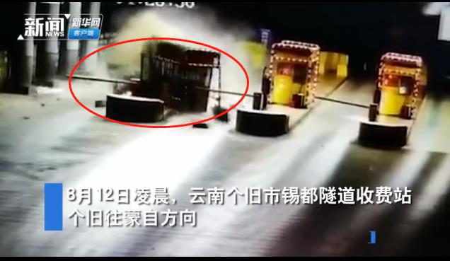 8月12日,云南个旧一男子凌晨驾驶白色轿车快速驶向锡都隧道收费站,瞬间撞翻安全隔离岛和收费站。