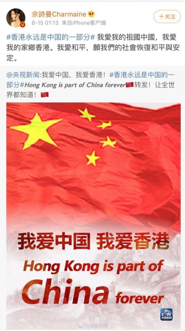 今日(15日)凌晨,香港艺人佘诗曼转发央视新闻微博,坚定表示:我爱我的祖国中国,我爱我的家乡香港。我爱和平,愿我们的社会恢复和平与安定。