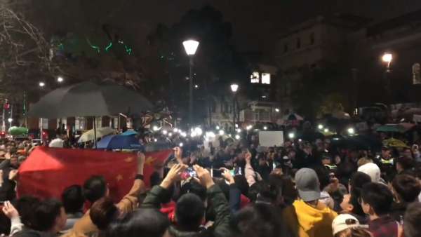 当地时间16日晚,澳大利亚墨尔本州立图书馆前,部分“港独”集会于此,墨尔本中国留学生及华人移民自发来到集会地点挂起国旗,声援祖国,高唱国歌,将“港独”团团包围。