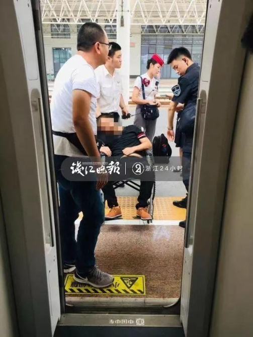 8月15日中午,从上海开往杭州的D3291列车在出发10分钟左右,突然,车厢内响起乘务长的紧急呼叫广播:11车厢有乘客身体突发状况,需要紧急寻找医务人员。