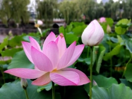 在扬子江路西侧的区域内,有清浅池塘,塘中荷花盛开,十分漂亮。塘边建设了一个半圆形的观景平台,平台上安装有漂亮的栏杆,市民可以在观景平台上零距离亲水,欣赏美景。