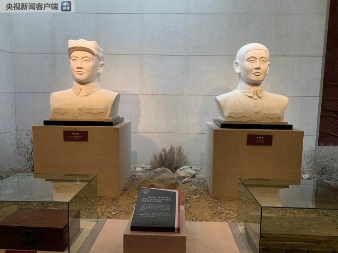 △红五军军长董振堂和红五军政治部主任杨克明的塑像。他们在1937年1月与国民党军队在高台经过九天八夜的血战后牺牲,董振堂牺牲时42岁,杨克明牺牲时32岁。塑像旁的照片记录下高台血战的惨烈。(央视记者段德文拍摄)