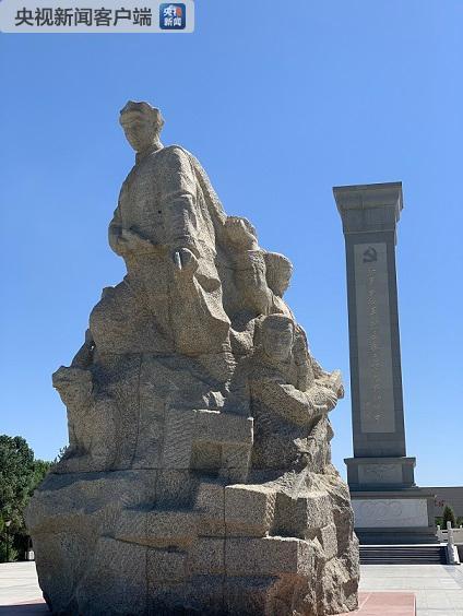 △中国工农红军西路军纪念碑,高29.37米。碑身正面上方镌刻党徽。党徽下方为红西路军第三十军政委、原国家主席李先念1987年题词:“红军西路军烈士永远活在我们心中”。(央视记者许永松拍摄)