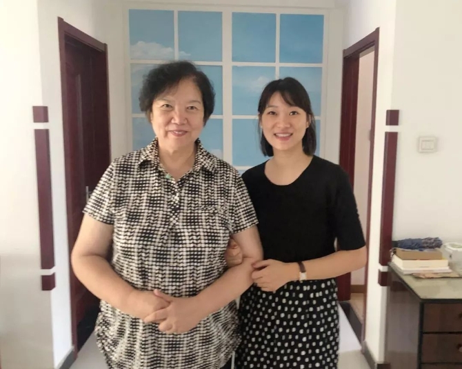 央广记者李欣在邢淑华家中采访合影,后面的蓝天白云背景为邢淑华自己绘制