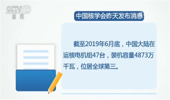 中国核学会昨天(21日)发布消息,截至2019年6月底,中国大陆在运核电机组47台,装机容量4873万千瓦,位居全球第三。据介绍,“十三五”期间,全国核电投产约1900万千瓦、开工760万千瓦以上,预计2020年装机容量达到5103万千瓦。