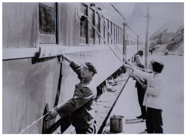 过去列车员手工清洗车身(央广网发 银川客运段供图)
