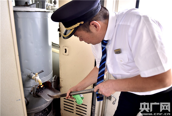 列车员正在为锅炉添煤(央广网记者 王晶 摄)
