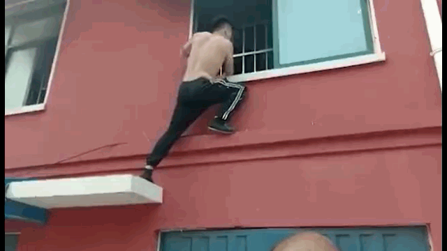 确定被困女孩所在房间后,张豪杰打量了一下那个窗口的位置,双手扒着车库顶上的门缝,在其他居民的托举下爬到窗户侧下方的空调室外机平台。