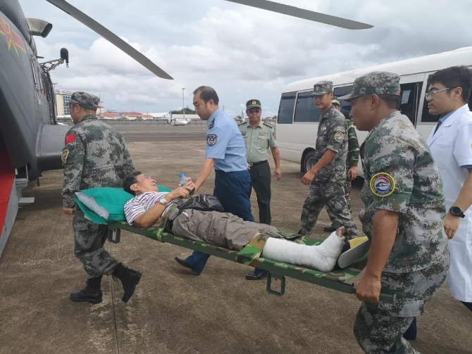 22日下午3时40分,包括2名重伤员在内的3名受伤中国游客在我军“和平列车”医疗队医护人员护送下,乘坐我军直-8G新型加改装救护直升机,从万象瓦岱机场起飞回国。稍后,我军医疗队医护人员又护送另1名伤情严重的中国游客乘坐中国东方航空公司MU2574航班返回昆明。