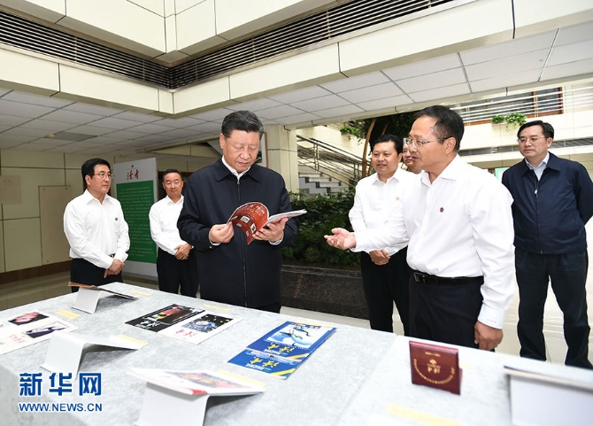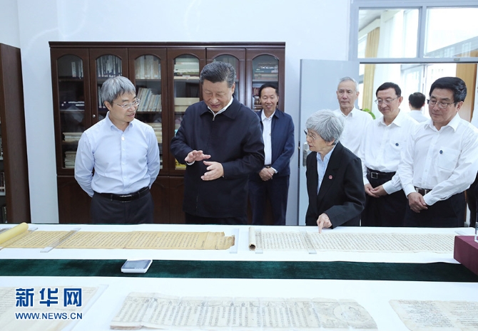 习近平在敦煌研究院察看珍藏文物和学术成果展示,了解文物保护和研究、弘扬优秀历史文化情况。