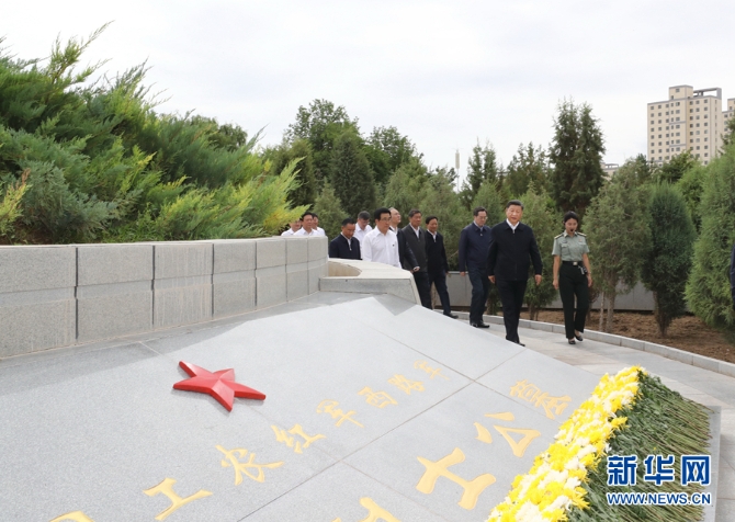 离开嘉峪关,习近平来到张掖市高台县,瞻仰中国工农红军西路军纪念碑和阵亡烈士公墓,参观中国工农红军西路军纪念馆,向革命先烈敬献花篮。