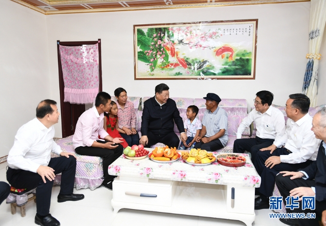 习近平在武威市古浪县黄花滩生态移民区富民新村村民李应川家,同李应川一家拉家常。