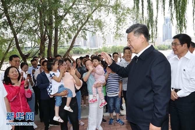 习近平在兰州市黄河治理兰铁泵站项目点同正在休闲的群众亲切交谈。