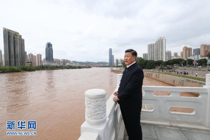 习近平在兰州市黄河治理兰铁泵站项目点,沿步道察看黄河两岸生态修复和景观建设情况。