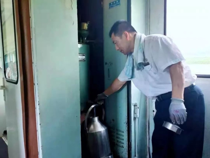他还要在一节一节车厢间不停地穿梭送水