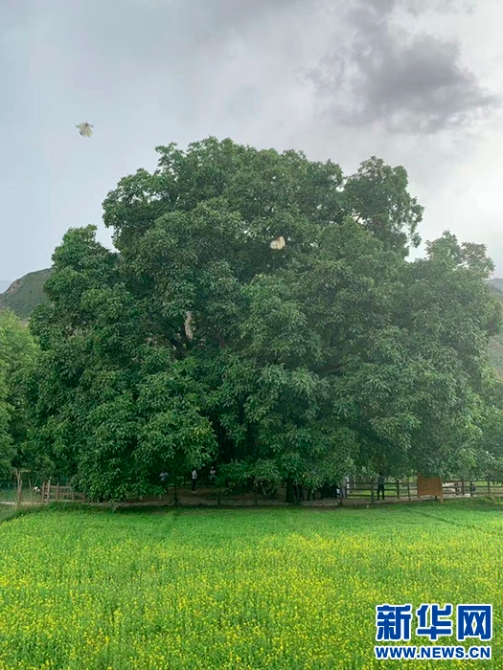 新华网拉萨8月23日电 刘子明 刘世东 22日,在西藏林芝朗县冲康村,十几个青年人手挽着手合抱一棵核桃树,丈量这棵2000多年的古树树围。遮天蔽日的树冠,犹如一轮巨大伞盖,洒下一片清凉。树影斑驳间,累累核桃果点缀在古树上,真是一片绿叶成荫子满枝的景象。