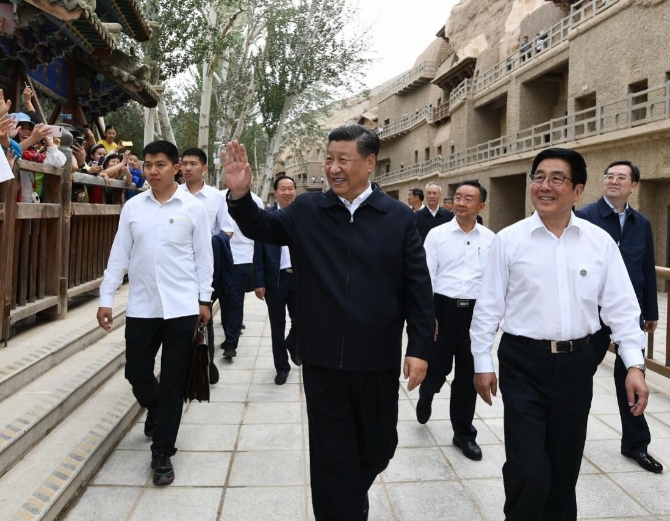 8月19日下午,习近平在敦煌莫高窟考察调研时,向正在参观的游客亲切招手致意。