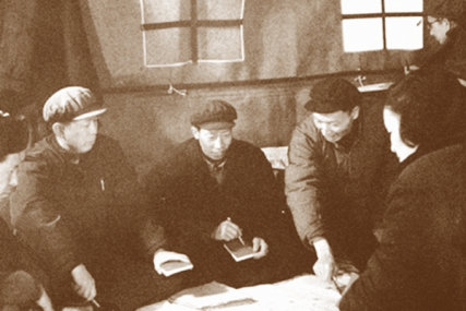 老领导祝麟芳(右二)与原公浦(左一)等在一起进行技术攻关。资料图