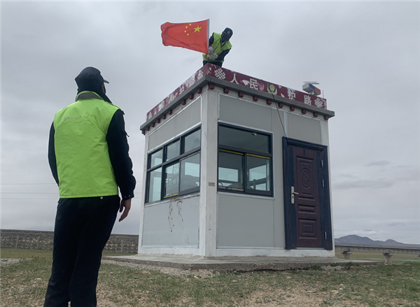 护路队员为值守岗亭换上新国旗。人民网 宋晨 摄